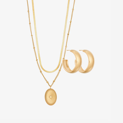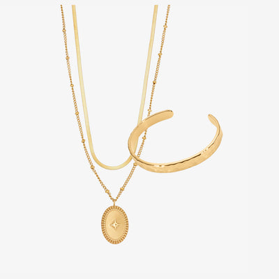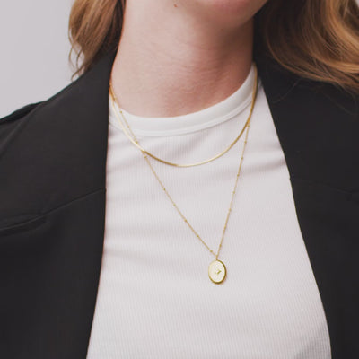 Vårt Dubbelhalsband - Platt + Emblem har en uttrycksfull design med många fina detaljer. Här får du två halsband i ett och kan enkelt skapa ett rikt och livfullt smyckeuttryck.