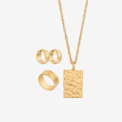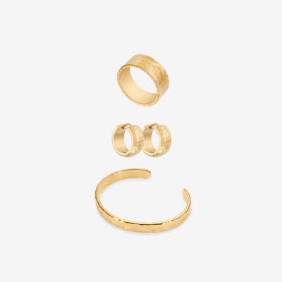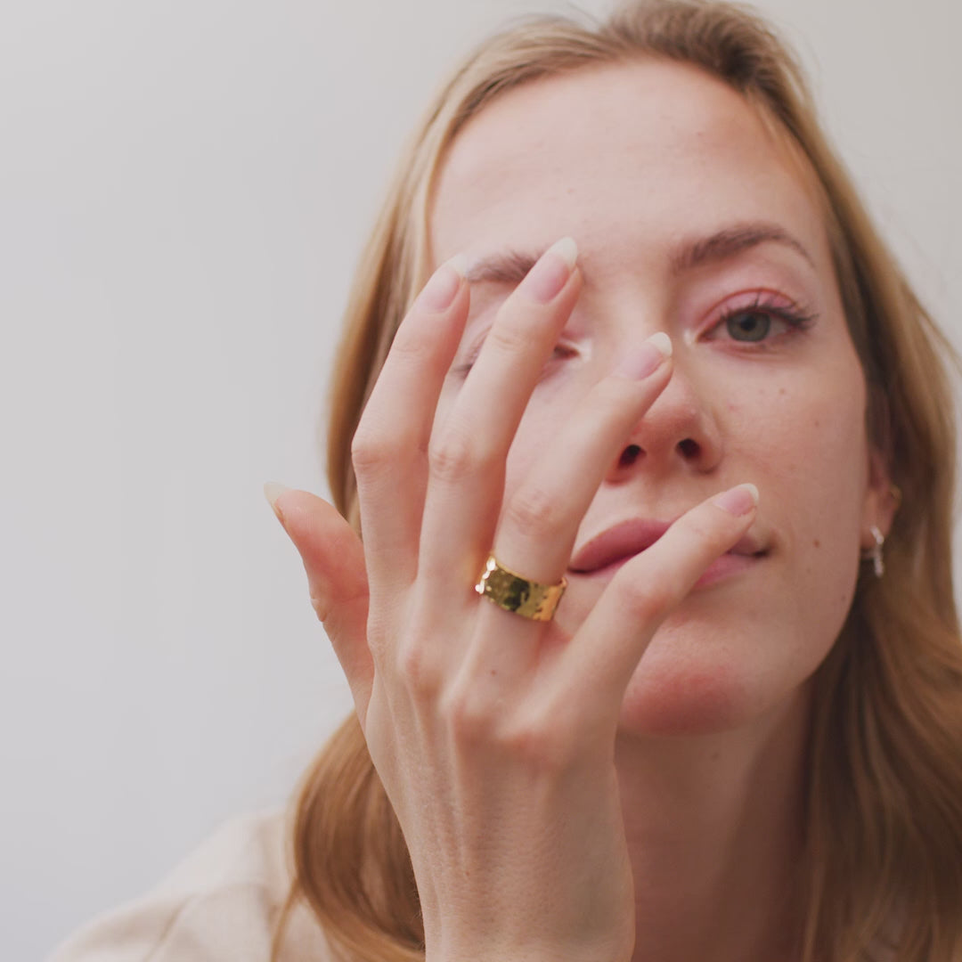 Vår Hammered Chunky Ring Gold Plated har en rå och uttrycksfull design. Den hamrade ytan ger struktur och kant till smycket, vilket är vackert både på egen hand och i kombination med andra designer.