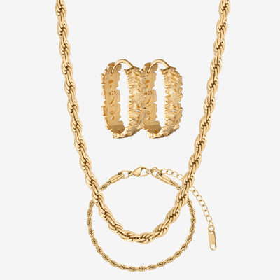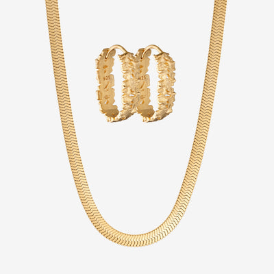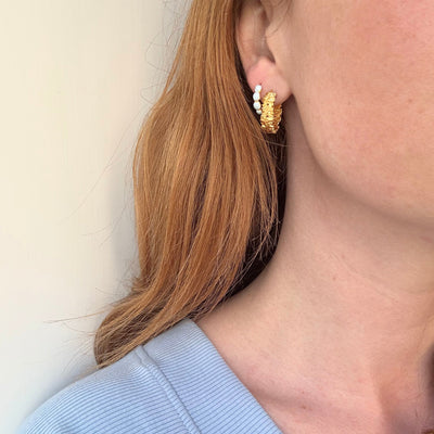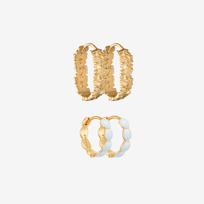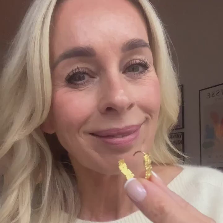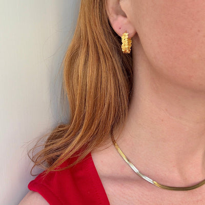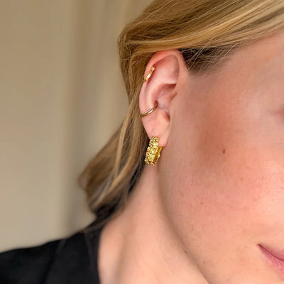 Våra Magma Rock Hoop-örhängen i guldplätering har en rustik design, men har samtidigt en vacker och elegant detaljnivå. De passar perfekt för både helger och vardagsbruk.